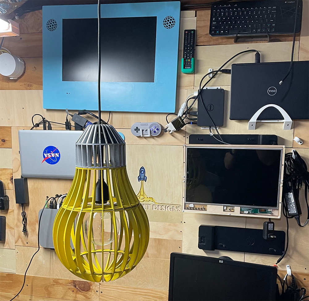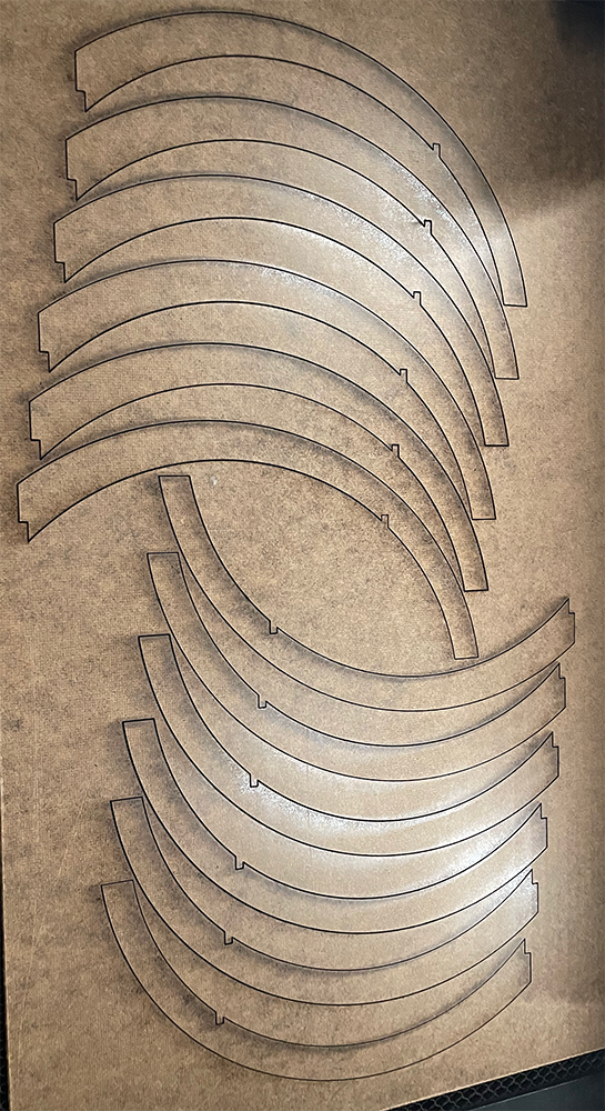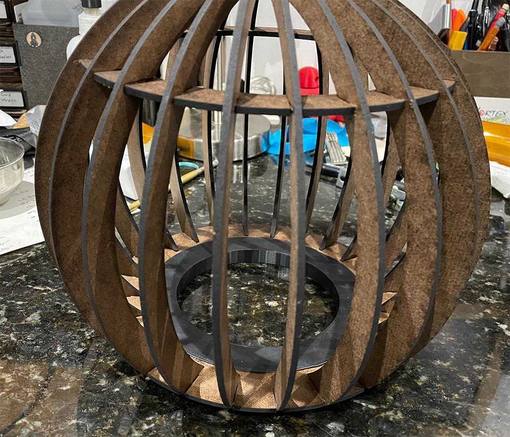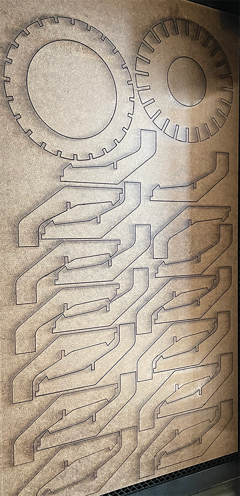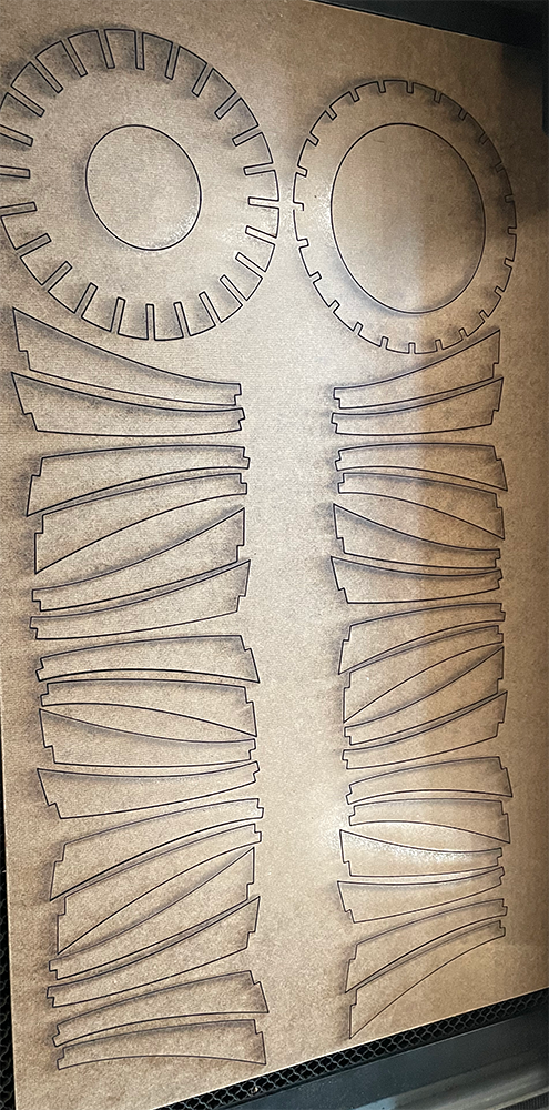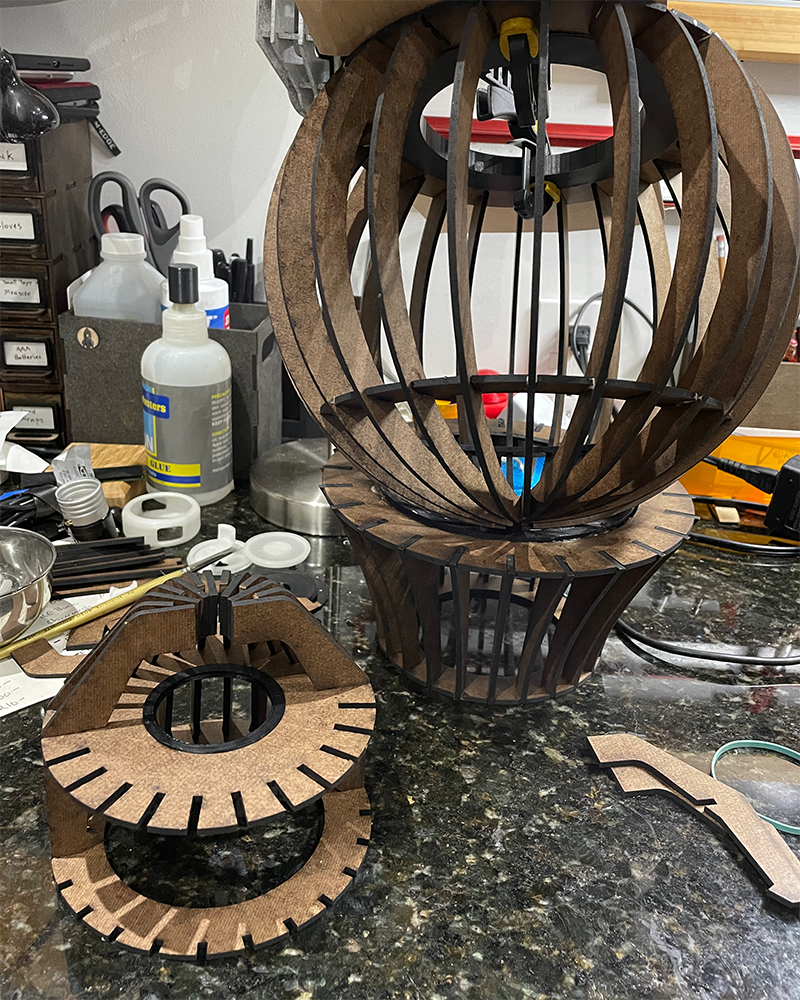 Laser cut wood, spray paint, and 3d printed parts.